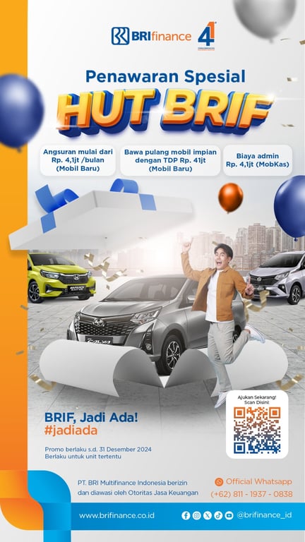 Menyambut perayaan baik ini, BRI Finance menawarkan banyak promo spesial untuk Kredit Kendaraan Bermotor (KKB). Adapun promo ini meliputi: angsuran mulai dari Rp 4,1 juta/ bulan untuk mobil baru, nasabah juga berkesempatan membawa pulang mobil impian dengan total down payment (TDP) Rp 41 juta untuk mobil baru, dan biaya admin hanya Rp 4,1 juta untuk mobil bekas (mobkas). Untuk kebutuhan dana tunai, jangan lewatkan pula produk BRI Flash. Pencairan BRI Flash dapat mencapai hingga 90% dari harga kendaraan.